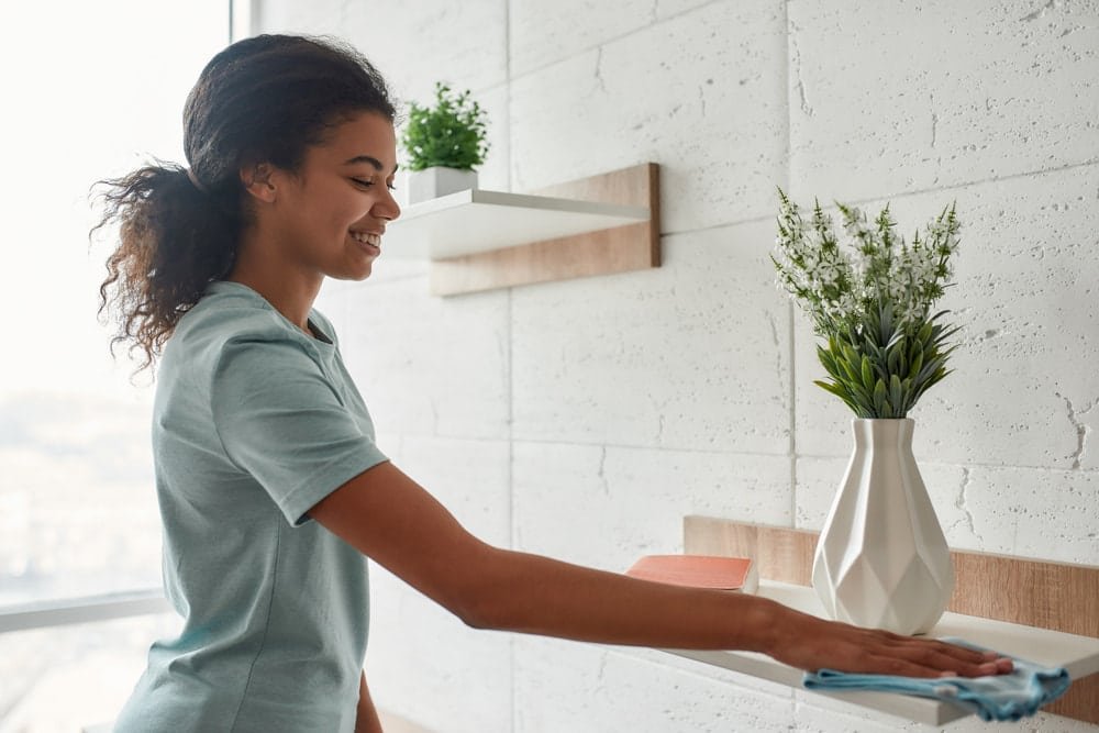 It’s important to have suitable tools to thoroughly remove dust. The most effective option is a damp microfiber cloth, but make sure it’s only slightly damp and not wet. This way, you’ll easily collect dust from places such as picture rails, cornices, or high shelves. Remember to always work your way from the top to the bottom of the room.