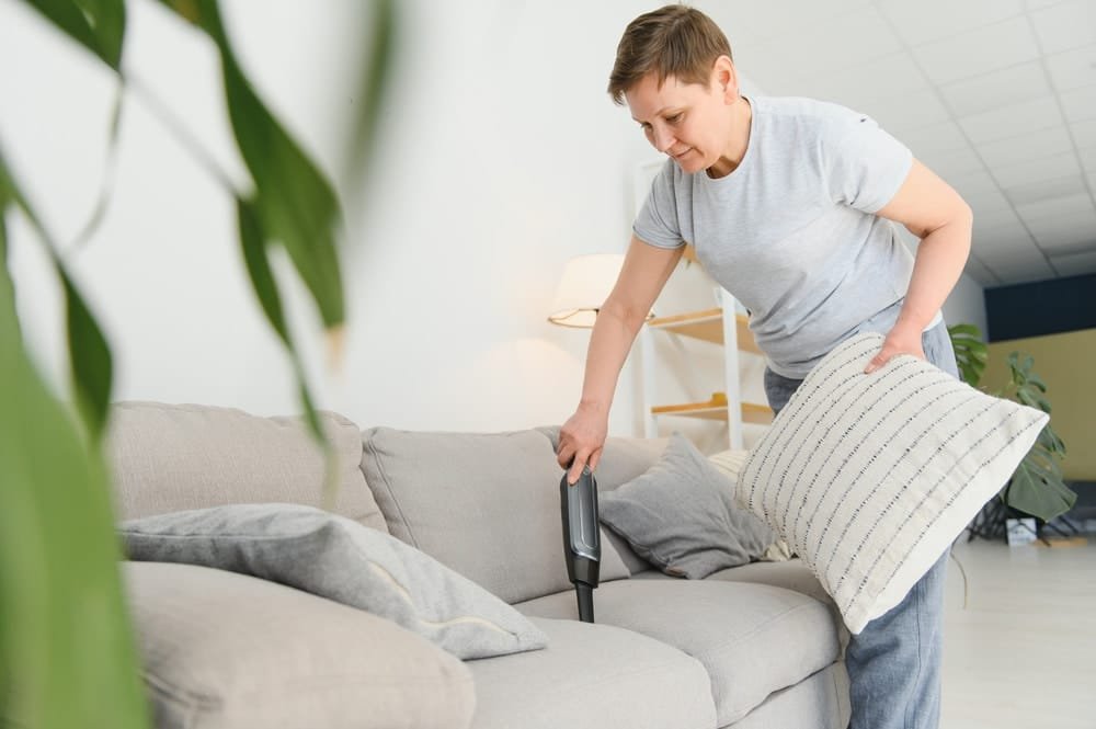 Include vacuuming your sofas and cushions in your weekly routine to keep dust mites under control. If there are any removable covers or pillow cases, wash them according to the label instructions. You can use a damp cloth to wipe down the hard parts.