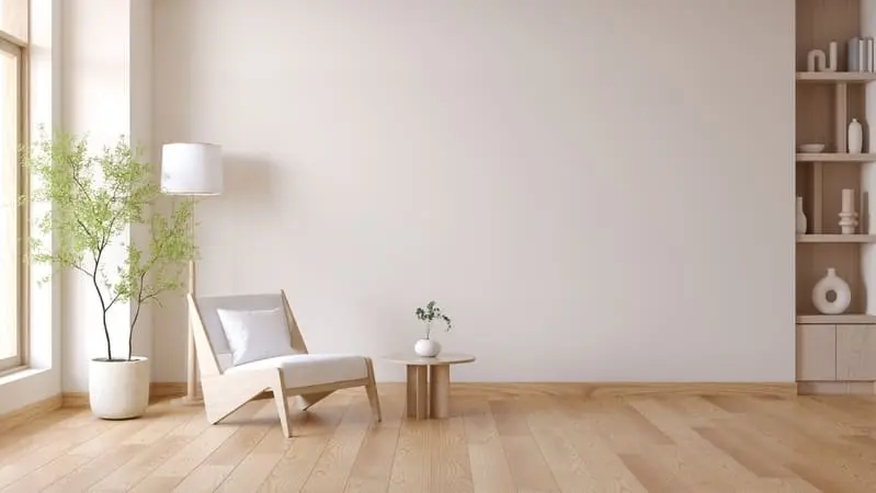 Minimalist living room with clean white walls, wooden floors, and natural light—ideal example of results from learning how to clean walls effectively.