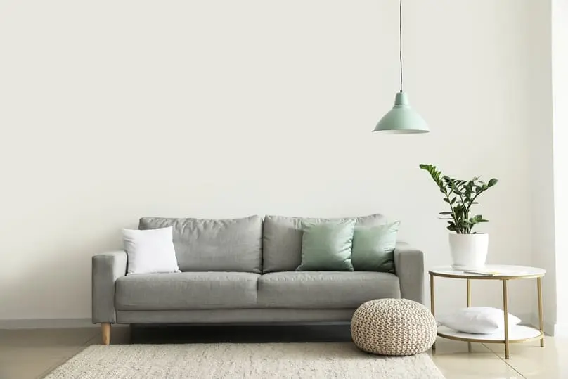 Modern living room with a clean gray fabric couch, illustrating results of learning how to deep clean a couch effectively at home.